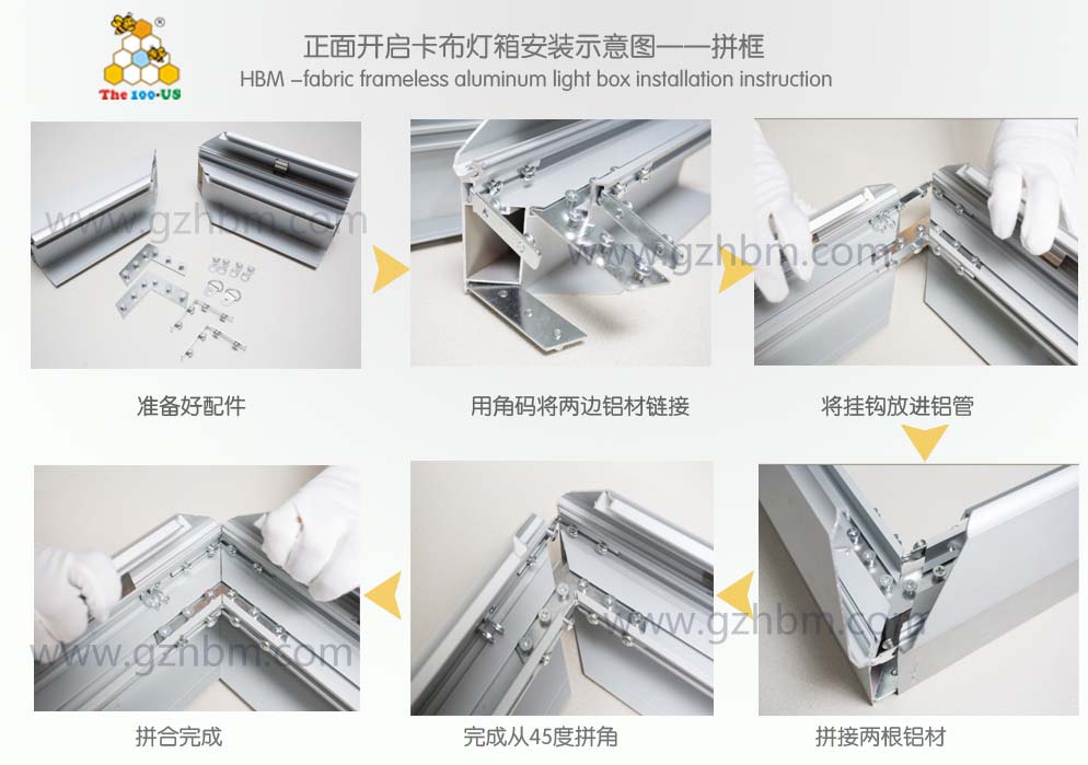 由于拉布燈箱比較大,重量輕,所以匯百美拉布燈箱廠家會建議客戶拆卸式包裝運輸,也就是將鋁材、配件以及畫布分開打包運輸,這樣一來可以大大地減少運輸費用,二來可以避免運輸過程中造成損壞,最后還是因為分開后好搬運,利于安裝,下面我們具體講一下安裝拉布燈箱的工序: