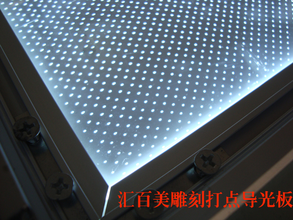雕刻導(dǎo)光板:雕刻導(dǎo)光板分為劃線導(dǎo)光板和激光打點兩種,劃線是指在亞克力板上通過激光機劃出一條條線槽,而打點是通過特定的激光技術(shù)打出一個個凹孔點陣的形式,讓光線在側(cè)面打光時折射出來,形成一種聚光勻光的作用。這個目前可以將光源轉(zhuǎn)化的最好的一種。但是雕刻導(dǎo)光板工藝復(fù)雜,耗時長,因而也相對比較貴些,目前一些對亮度要求特別高的用戶可以采用此種工藝來做超薄燈箱。超薄燈箱廠家
