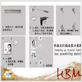 水晶燈箱類:包括水晶燈箱何感應(yīng)燈箱,這2種燈箱的安裝方法一致的,大概是這樣的:首先找好安裝的墻體,然后將燈箱上的廣告螺絲松下固定到墻體上,再將燈箱整體對(duì)著螺絲孔固定(如圖)